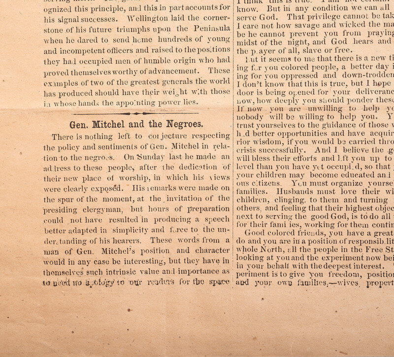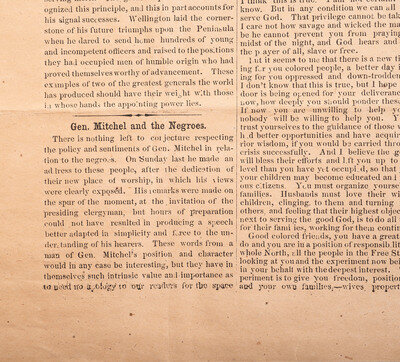 This issue contains news coverage of the beginning of the Port Royal Experiment, in which formerly enslaved people successfully worked on the land abandoned by planters. This issue also contains extensive local news coverage of the dedication of a new African American church built by the order of General Ormsby Mitchel, who was in charge of the Union forces as they occupied Port Royal, SC.