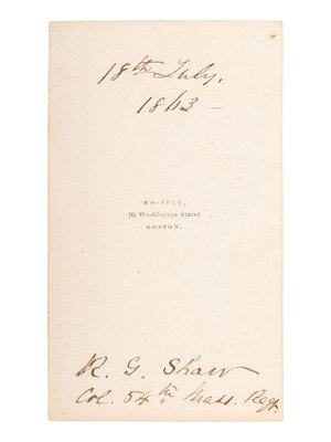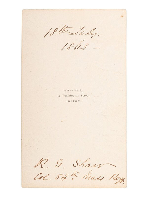 CDV on cardstock mount, standing portrait of Robert Gould Shaw in uniform. Verso with photographer's imprint and period inscription in unknown hand recording the date of the Colonel's death, "18th July 1863 / R.G. Shaw / Col. 54th Mass. Regt."