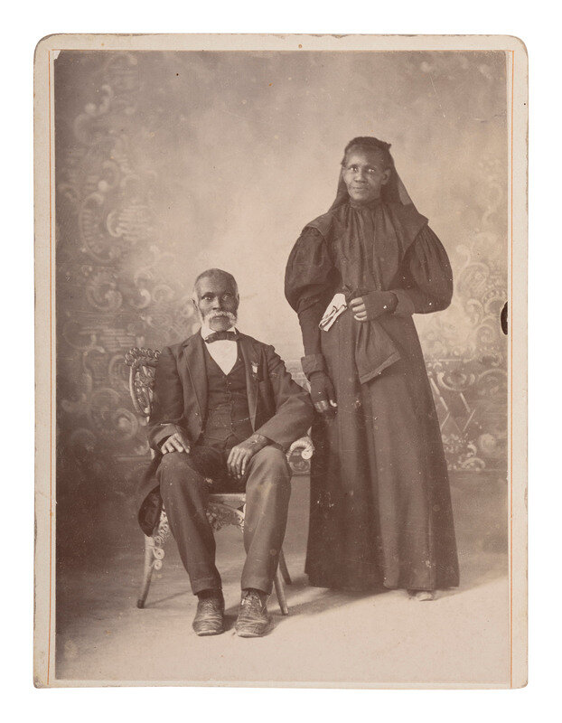A distinguished African American couple is featured, with the man seated in an ornate chair and the woman standing and wearing a long, dark dress and a long scarf over her head. The man bears a resemblance to Dr. Alexander Augusta, who served as a surgeon during the Civil War. Since there are no known images of Augusta as an older man, the identity of the sitter can only be speculative.