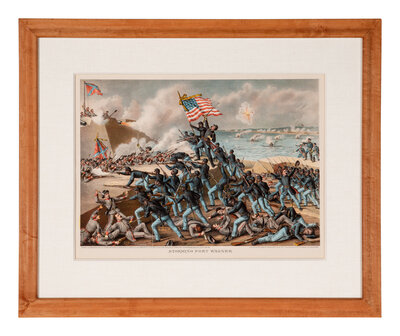 Kurz & Allison, a Chicago lithography firm known for its vivid prints that memorialized the American Civil War by capturing famous battle scenes, was also unique for including numerous depictions of Black participation and heroism in the Union struggle. "No one else in the late nineteenth century produced such heroic depictions of black soldiers" (Neely & Holzer, Union Image, p.218). A BRIGHT COPY depicting one of the most important battles of the American Civil War with an all-Black regiment at the forefront.