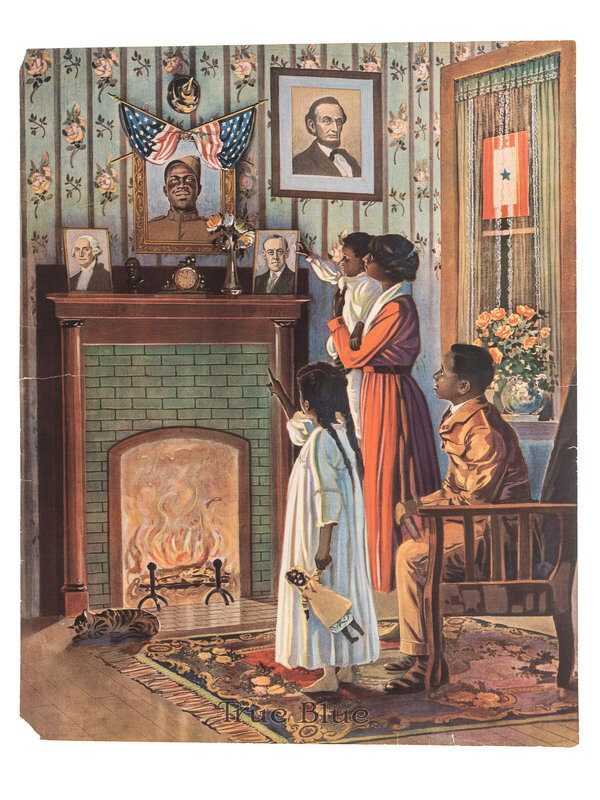 Recruitment poster showing a family admiring the portrait of the patriarch in uniform hanging over the mantle. The portrait is festooned with American flags and flanked by portraits of George Washington and Woodrow Wilson, a portrait of Lincoln hangs nearby. Over one million African Americans responded to draft calls, and roughly 370,000 African American men were inducted into the army.