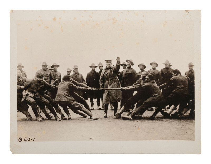 6 1/2 x 8 1/2 in. silver gelatin photograph of African American troops engaging in a tug-of-war contest. Verso with typed label describing the scene, "The Tug of War...The members of an infantry regiment participate in a tug of war in their camp somewhere in France. A captain of a machine gun company is serving as referee." Ink stamp indicates that the photo was released by Committee Pub. Inf. 17 April 1918.