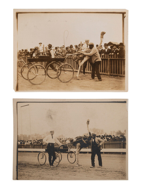 [With:] 2 silver gelatin photographs, 5 x 7 in., documenting both Black and white men engaged in an ostrich racing competition, ca early 1900s. During the late 19th-early 20th century, ostrich racing was common in the United States, especially in Florida, where the sport is said to be one of the state's oldest pastimes.