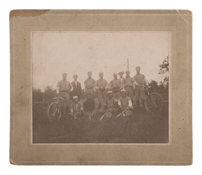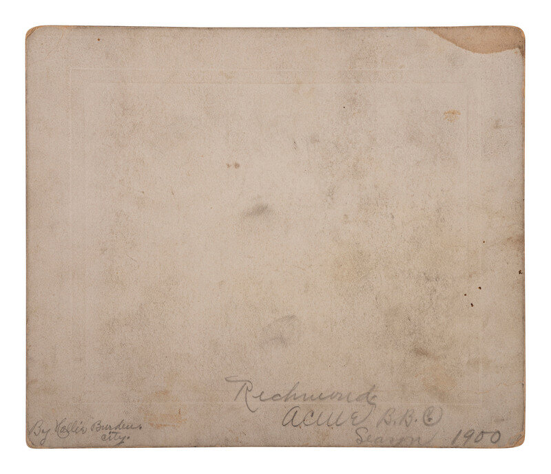 4 3/4 x 3 7/8 in. silver gelatin photograph on 6 3/8 x 5 3/8 in. cardstock mount with penciled inscriptions on verso reading, "By Hallie Burden / city," and "Richmond ACME B.B.C. Season 1900."