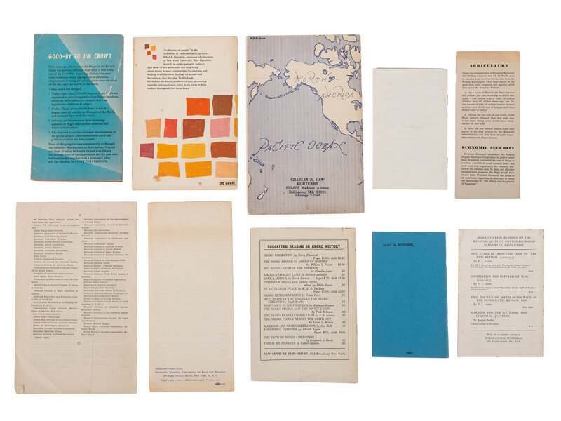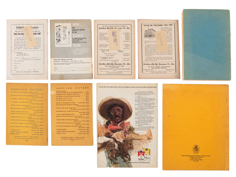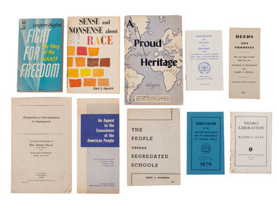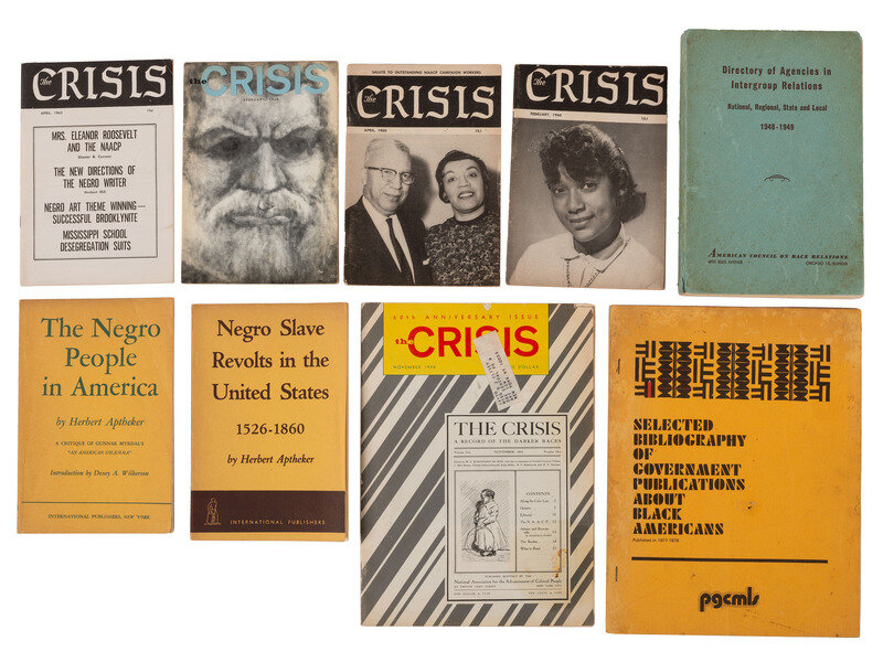 ALLEN, James S. Negro Liberation. New York, NY: International Publishers, 1938. -- APTHEKER, Herbert. Negro Slave Revolts in the United States. New York, NY: International Publishers, 1939. -- APTHEKER, Herbert. The Negro People in America. New York, NY: International Publishers, 1946. -- Elimination in Discrimination in Employment: Extension of Remarks of Hon. Dennis Chavez of New Mexico in the Senate of the United States Monday, May 26, 1947. Washington, DC: United States Government Printing Office, 1947. -- Directory of Agencies in Intergroup Relations: National, Regional, State and Local 1948-1949. Chicago, IL: American Council on Race Relations, ca 1949. -- WILKERSON, Doxey A. The People versus Segregated Schools. New York, NY: New Century Publishers, 1955. -- ALPENFELS, Ethel J. Sense and Nonsense About Race. New, Rev. Ed. New York, NY: Friendship Press, 1957. -- A Proud Heritage. New York, NY: Commercial Ad, Inc., 1962. -- HUGHES, Langston. Fight For Freedom: the Story of the NAACP. New York, NY: Berkley Publishing Company, 1962. -- And 8 other booklets including 5 issues of The Crisis magazine. -- Together, 17 booklets and publications.