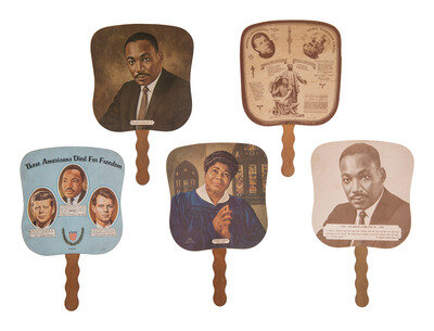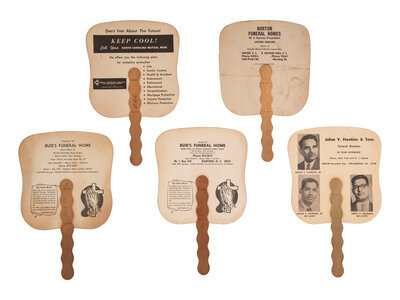 Included in the group are the following fans: "These Americans Died for Freedom" featuring the images of John F. Kennedy, Dr. Martin Luther King, and Robert F. Kennedy; verso with advertisement for Buie's Funeral Home in Raeford, North Carolina. -- "Mahalia Jackson / 1911-1972"; verso with advertisement for Buie's Funeral Home in Raeford, North Carolina. -- "1929 - Dr. Martin Luther King, Jr. - 1968"; verso with advertisement for Julian V. Hawkins & Sons Funeral Directors in Philadelphia, Pennsylvania. -- "Dr. Martin Luther King, Jr."; verso with advertisement for North Carolina Mutual Life Insurance Company in Durham, North Carolina. -- "Booker T. Washington" and "George Washington Carver"; verso with advertisement for Horton Funeral Homes in Sanford, North Carolina. This fan appears to be scarce, and is the earliest with a copyright of 1946.