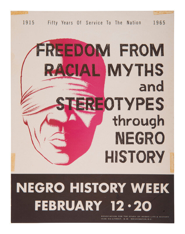 Freedom from Racial Myths and Stereotypes through Negro History / Negro History Week / February 12-20. Washington, DC: Association For The Study Of Negro Life & History. 11 x 8 1/2 in. poster. Additional text at top "1915 / Fifty Years Of Service To The Nation / 1965."