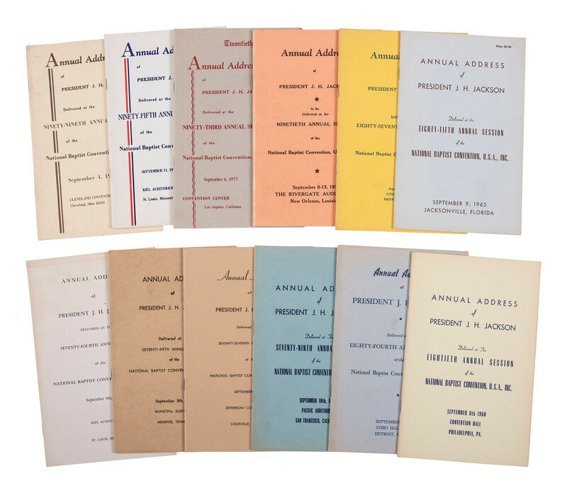 A group of 12 staplebound booklets, each a copy of an Annual Address of President J.H. Jackson. [Chicago?]: National Baptist Convention, USA, Inc., 1954-1979. Annual addresses are for the 74th, 75th, 77th, 79th, 80th, 84th, 85th, 87th, 90th, 93rd, 95th, and 99th Annual Sessions which were hosted at various cities around the country. Booklets approx. 5 1/2 x 8 1/2 in. Various pagination.