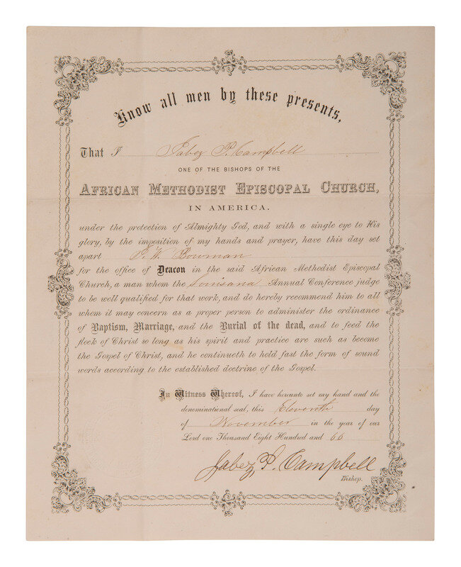 10 1/2 x 8 1/4 in. partially printed document appointing J.W. Bowman a "Deacon" in the African Methodist Episcopal Church, and recommending him as a proper person to administer baptism, marriage, and burial of the dead. Signed at bottom "Jabez P. Campbell" as Bishop of the AME Church. 11 November 1866. With embossed seal of the AME Church at lower left.