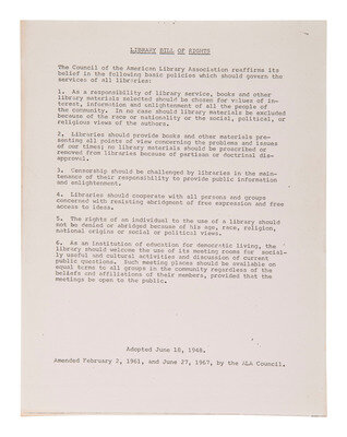 8 1/2 x 11 in. typed copy of the "Library Bill of Rights," being a list of 6 basic policies governing the service of libraries, adopted by the Council of the American Library Association. Beneath the list, text reads, "Adopted June 18, 1948 / Amended February 2, 1961, and June 27, 1967, by the ALA Council.