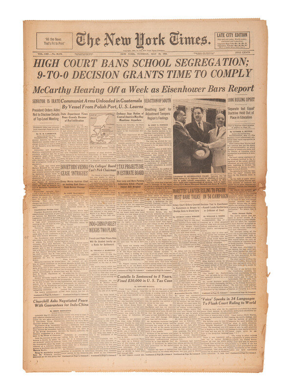 Vol. CIII, No. 35,178. 18 May 1954. Brown vs. Board of Education bans racial segregation in public education, with headline, “High Court Bans School Segregation; 9-0 Decision Grants Time to Comply.”