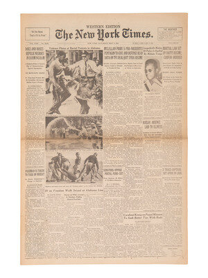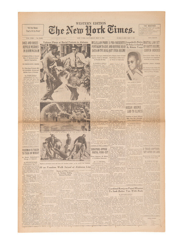 Vol. CXII, No. 38,451. 4 May 1963. Dogs and high pressure water hoses used by police to drive back African Americans protesting racial segregation in Birmingham, Alabama, with dramatic photos and heading, “Dogs and Hoses Repulse Negroes in Birmingham.”