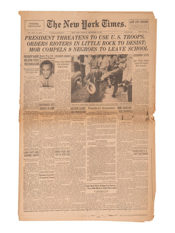 Vol. CVII, No. 36,403. 24 September 1957. President Dwight Eisenhower threatens to send federal troops to Little Rock, Arkansas to enforce racial desegregation at Central High School in Little Rock, with headlines, “President (Eisenhower) Threatens To Use US Troops / Orders Rioters in Little Rock To Desist / Mob Compiles 9 Negroes to Leave School.”