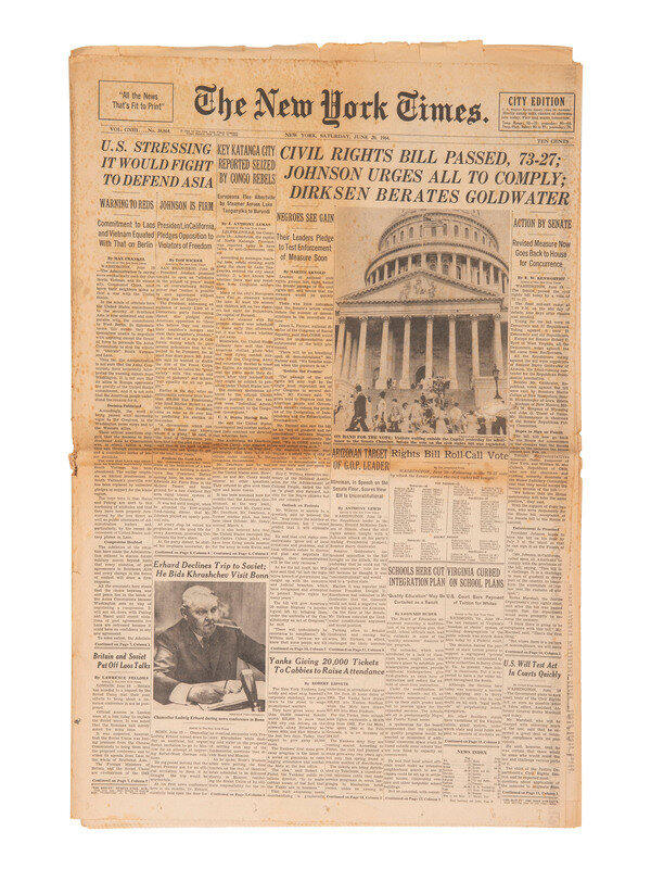 Vol. CXIII, No. 38,864. 20 June 1964. The wide-ranging Civil Rights Bill of 1964 is passed by the US Congress, with headline, “Civil Rights Bill Passed, 73-27; (President Lyndon) Johnson Urges All To Comply...”