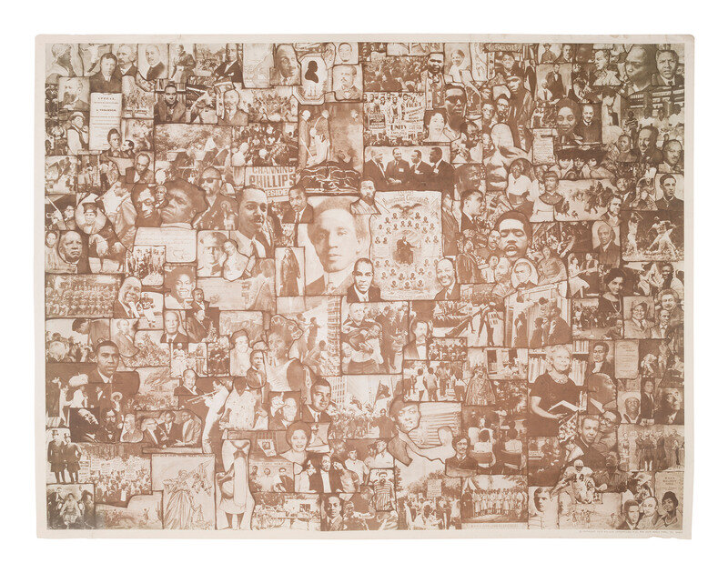 Sepia-toned printed composite photograph made up of dozens of images of people, events, and objects related to the African American experience and the Civil Rights Movement.