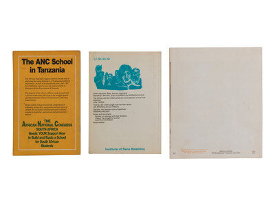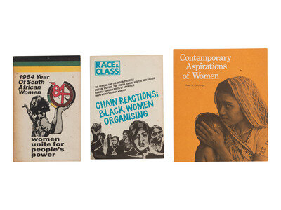 Race & Class: A Journal For Black and Third World Liberation. Vol. XXVII, No. 1. London: Institute of Race Relations, Summer 1985. Cover features graphics and title of featured article, "Chain Reactions: Black Women Organising," by Beverley Bryan, Stella Dadzie, and Suzanne Scafe. -- 1984 Year of South African Women. New York: African National Congress (South Africa), ca 1984. Contents include an historical overview of the South African women's struggle against apartheid, and suggested activities for the marking of 1984 as the "Year of the Women of South Africa." -- CATCHINGS, Rose M. Contemporary Aspirations of Women. N.p.: Education and Cultivation Division, Board of Global Ministries, The United Methodist Church, ca 1970s. Tri-fold pamphlet outlining the ways in which the Ministry of Women's Office has worked to support women's liberation through relationships with other organizations and groups, developing models of United Methodist leadership training, financial support, and more. -- Together, 3 printed works.