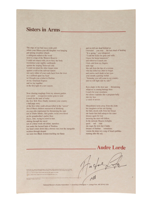 11 x 17 in. printed poster featuring the text of Lorde's poem, Sisters in Arms, arranged in two columns. Her signature appears to the lower right. Imprint along bottom edge identifies the poster as being produced by/for the National Women's Studies Association at the University of Maryland in College Park, MD, 1986.