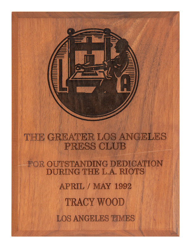Wood plaque, 6 x 8 in., "The Greater Los Angeles Press Club" award, presented to Tracy Wood of the Los Angeles Times "For Outstanding Dedication During the L.A. Riots / April / May 1992." The top portion of the award features the logo of the Los Angeles Press Club, a stylized image of a printer at a traditional printing press with the letters "L" and "A" on either side, and encircled in a motif evoking a camera lens.