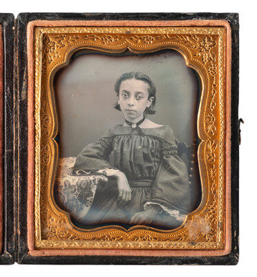 Sixth plate seated studio portrait of a young girl of mixed ethnicity. (Tarnishing to edges; resealed.) Housed in a pressed paper case.