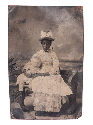 4 3/4 x 3 1/8 in. tintype portrait of a young Black woman seated on a bench in a studio beside a white, toddler-aged child. They pose before a painted backdrop depicting a seascape (some creasing throughout plate, scattered surface abrasions).