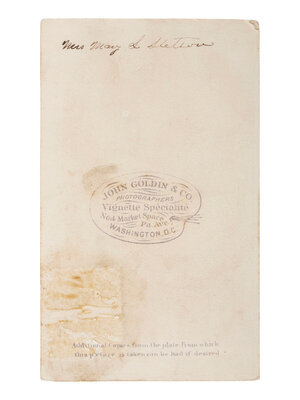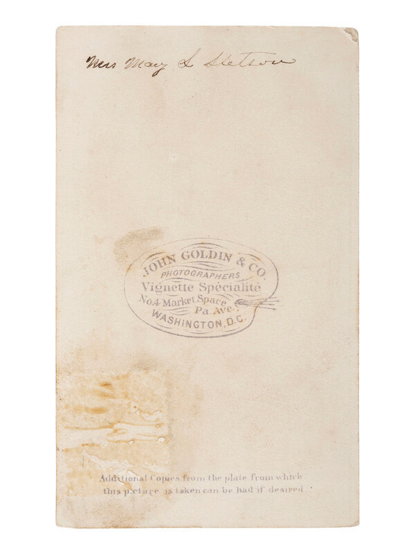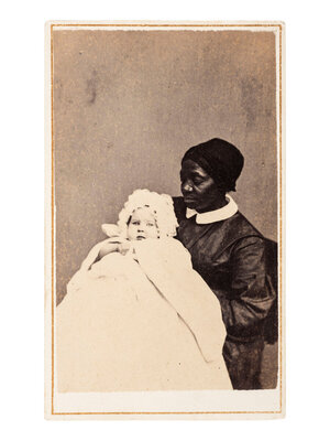 Intimate studio portrait of an African American nanny holding a white child dressed in a voluminous gown. 2 1/4 x 3 5/8 in. CDV on larger cardstock mount (some wear to print and mount edges). Washington, DC: John Goldin & Co. Verso with photographer's imprint and period manuscript identification, "Mrs. Mary S. Stetson." -- Portrait of an aged African American gentleman seated in a wicker chair, affectionately posed with a young white girl. 2 1/2 x 3 1/2 in. silver gelatin photograph on 4 1/4 x 6 3/8 in. cardstock mount (very fine condition). Uncredited, n.d., ca early 20th century. -- Outdoor portrait of an African American woman who looks lovingly at a white child sitting upon her knee. 4 3/4 x 7 3/4 in. silver gelatin photograph on 8 x 10 3/8 in. cardstock mount (toning and some chipping to mount edges). Uncredited, ca 1926. With manuscript notation to mount verso, "Georgia and Aunt Ella Edmonds - about 1926. Aunt Ella was born in Slavery." -- Together, 3 photographs.