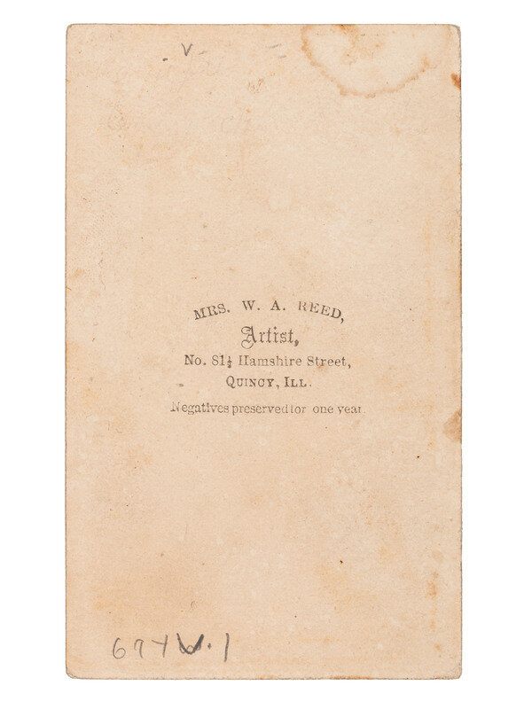 The CDV includes the verso imprint of Mrs. W.A. Reed of Quincy, IL. The photographer, whose full name is Candace McCormick Reed (1818-1900), was a Tennessee native who moved to St. Louis, MO, as a young girl and married Warren Reed in 1842. The Reeds left Missouri for Quincy, IL, and opened a daguerreotype gallery in 1848. Following the death of her husband in 1858, Candace Reed became the sole gallery owner and used her acquired skills as a daguerreotypist, ambrotypist, and photographer to support herself and her family. Reed later sold this business and opened her own Excelsior Gallery, with her sister working as her assistant. Reed typically operated under the name "Mrs. W.A. Reed," or "Mrs. Warren Reed."