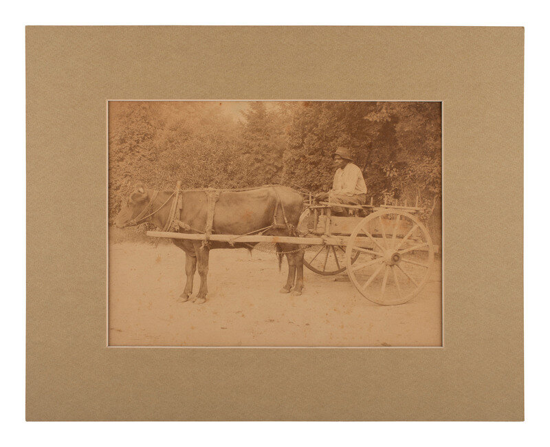 6 3/4 x 9 1/4 in. (sight) albumen photograph of an African American man driving an ox-drawn cart. Mounted on cardstock and matted for display. Uncredited, ca last quarter 19th century.