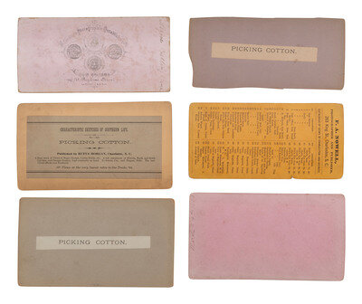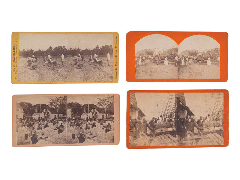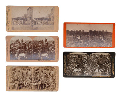 [With:] 10 stereoviews of African Americans picking and selling cotton. Highlighted scenes include: MORGAN, Rufus. "Picking Cotton." Charlotte, NC. -- HAVENS, O. Pierre, photographer. "Shipping Cotton." Savannah, GA. -- Uncredited stereoview showing a large group of African American women seated among piles of cotton. -- And 7 others credited to Alfred S. Campbell, Strohmeyer & Wyman, H.C. White Co., and Keystone View Co.