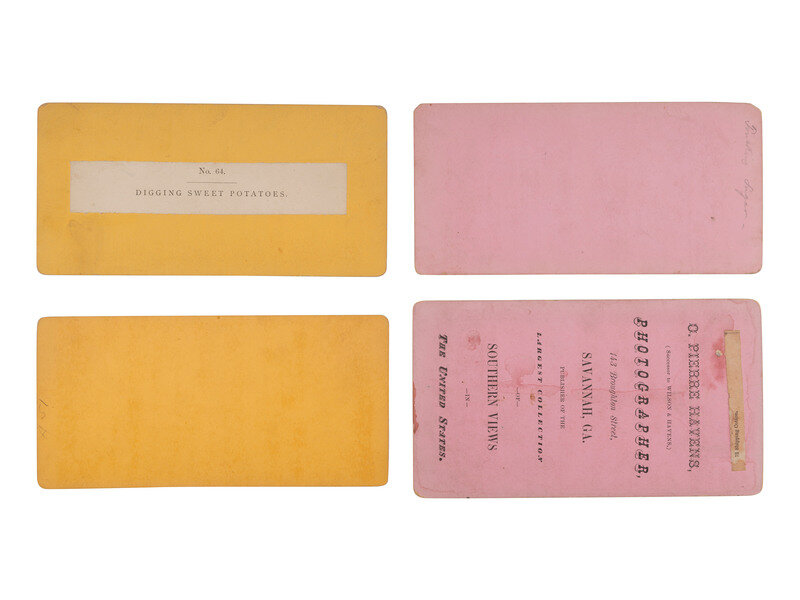 BARNARD, G.N., photographer. "Digging Sweet Potatoes." Charleston, SC, ca late 1860s. -- NOWELL, F.A., photographer. Scene of African Americans digging sweet potatoes, identical to the Barnard view. Charleston, SC. -- LILLIENTHAL, photographer. "Negroes Cutting Cane." New Orleans, LA. -- BLESSING, S.T., photographer. "Cutting Sugar Cane." New Orleans, LA. -- "Trucking Sugar." Uncredited stereoview showing a group of African American men and women standing near large barrels of sugar loaded on a wheeled cart.
