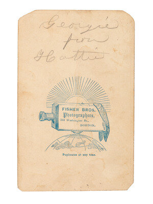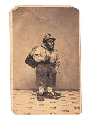 CDV on cardstock mount, standing portrait of an African American little person wearing a cap, shirt, pants, tall socks, and pointed shoes. He carries what appears to be a shoeshine box over his shoulder. Boston: Fisher Brothers, ca 1860s.