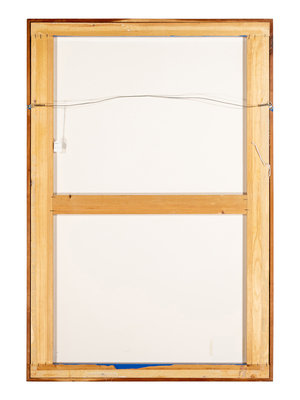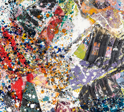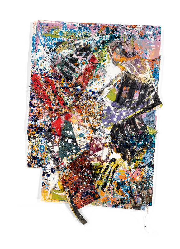 raked polypropylene, acrylic and monoprint on collaged and sewn fabric and paper with metal fasteners