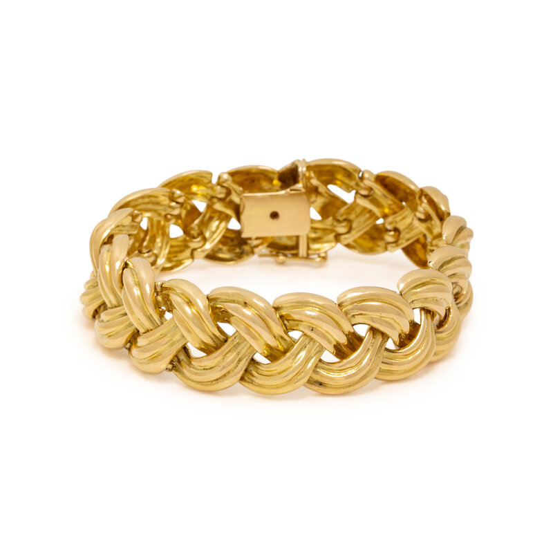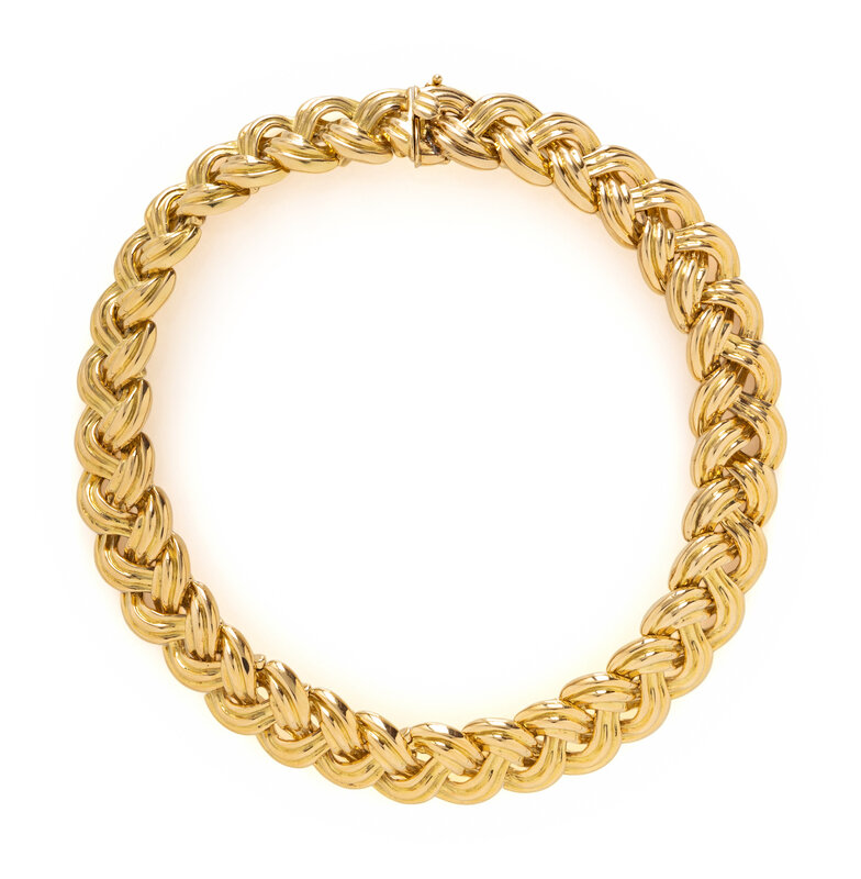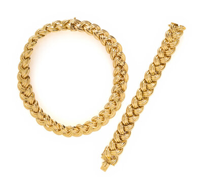 Consisting of a necklace and bracelet with braided links measuring approximately 15.00 mm wide. 18 karat yellow gold. 13 3/4 and 6 3/8 inches long.