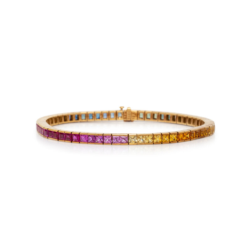 Designed as a line of gradient princess cut colored sapphires including shades of blue, pink, yellow, and green. Mounted in 18 karat yellow gold. 6 7/8 inches long.
