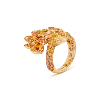 Depicting a peacock set with a gradient of round and pear faceted sapphires, with pear shaped diamonds eyes and round brilliant cut diamonds set in the crest. Mounted in 18 karat yellow gold. Ring size 7.