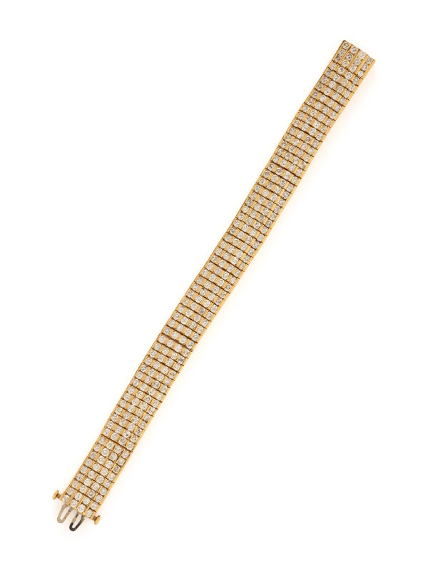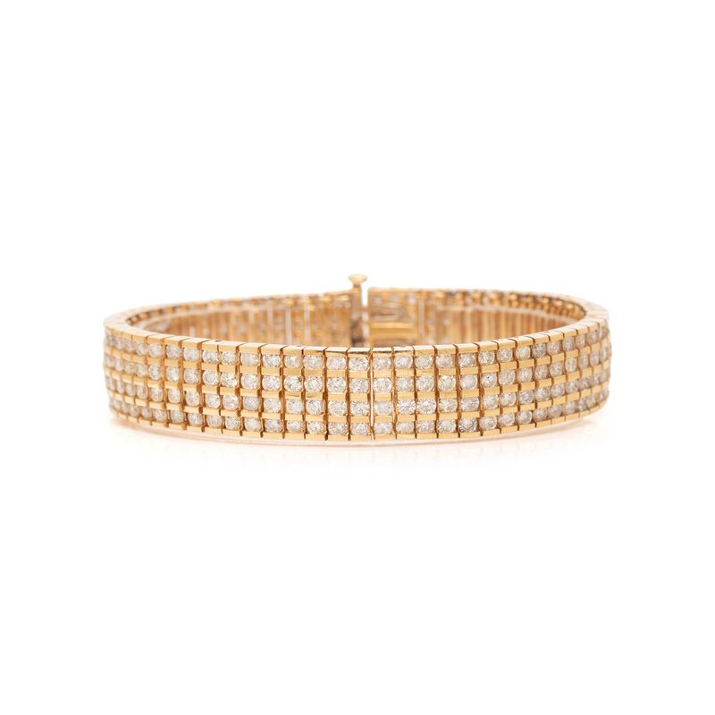 Containing channel-set round brilliant cut diamonds weighing approximately 16.00 carats total. Mounted in 18 karat yellow gold. 7 3/4 inches long, 9/16 inch wide.