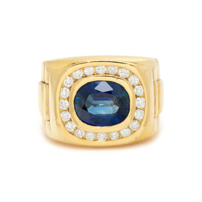 Centering an oval faceted sapphire measuring approximately 10.95 x 9.15 x 5.05 mm, with round brilliant cut diamonds weighing approximately 0.70 carat total. Mounted in 18 karat yellow gold. Ring size 8 3/4.