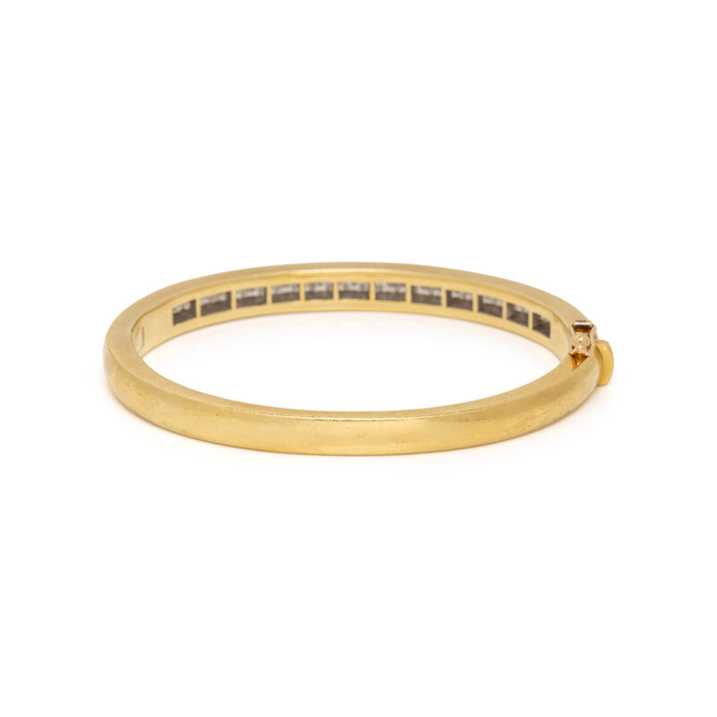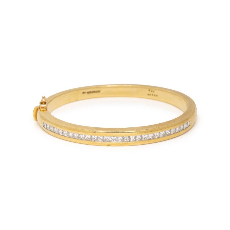 Consisting of high polish gold bangle with central row of channel set princess cut diamonds weighing approximately 2.60 carats total, hinged with side clasp. Mounted in 18 karat yellow gold. 6 1/2 inches inner circumference.