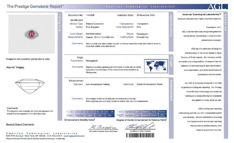 AGL, 2024 Report No. 1144506, Natural Corundum, Pink Sapphire, Madagascar, Low temperature heating