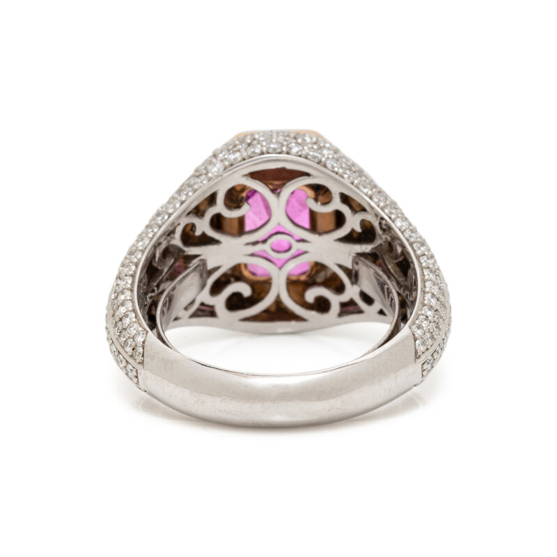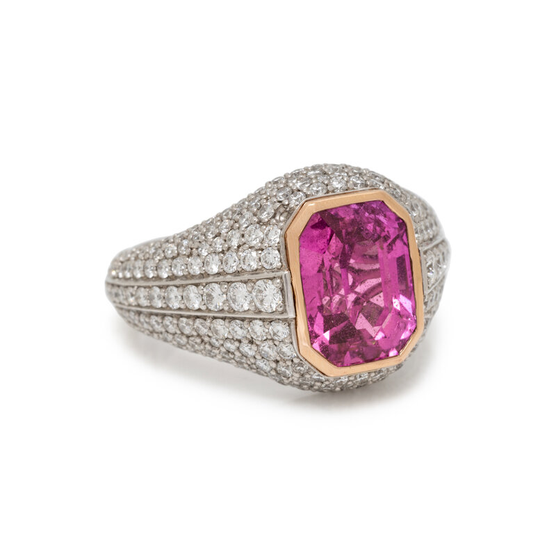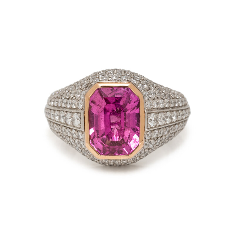 Centering an emerald cut pink sapphire measuring approximately 10.10 x 7.50 x 6.02 mm, with pavé-set round brilliant cut diamonds weighing approximately 1.95 carats total. Mounted in platinum and rose gold. Ring size 6 1/4.