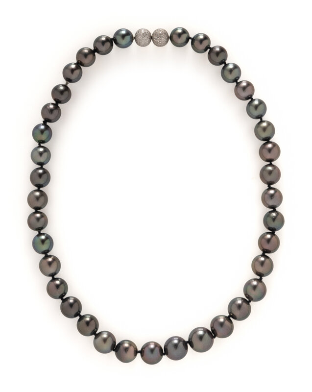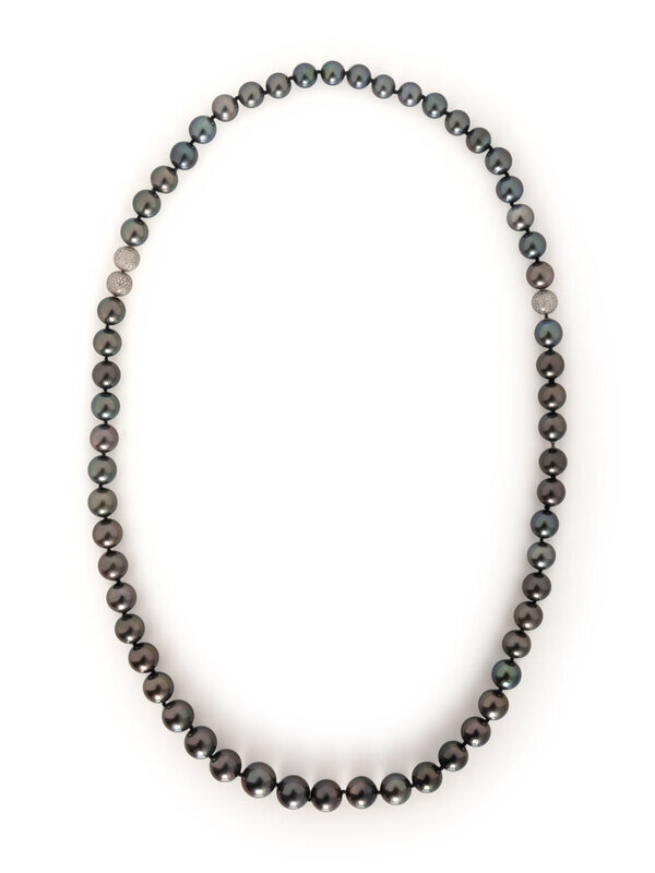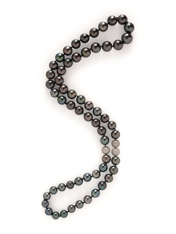 Comprised of two strands of 58 graduated Tahitian cultured pearls measuring approximately 10.40 - 15.40 mm, with three screw-down ball clasps pavé set with round brilliant cut diamonds. 10 3/8 and 21 inches long.