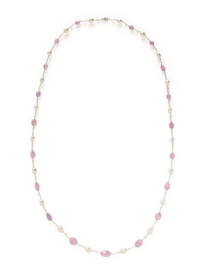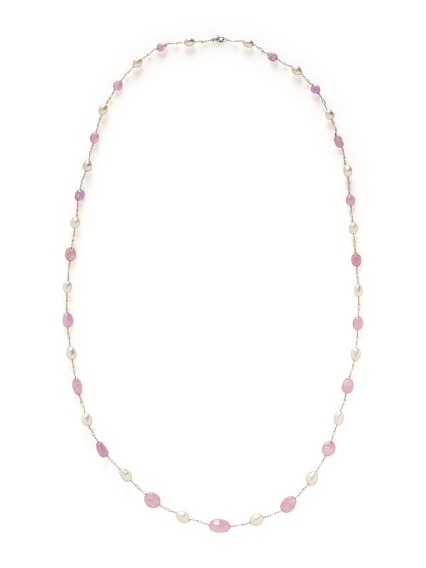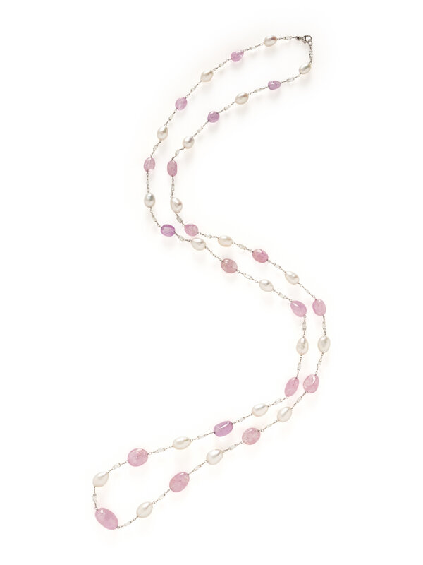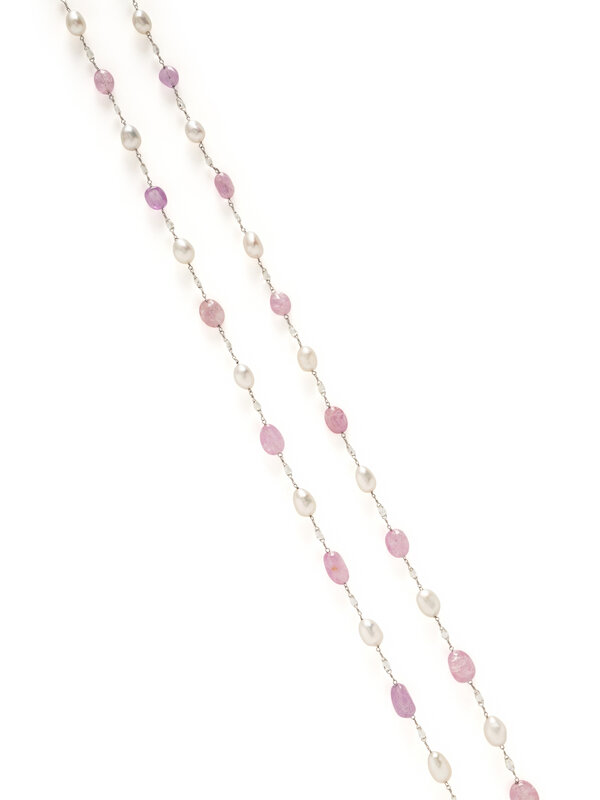 Consisting of baroque cultured pearls measuring approximately 6.00 - 7.50 mm, interspersed with tumbled pink sapphire beads, and briolette diamonds. Mounted in platinum. 36 inches long.