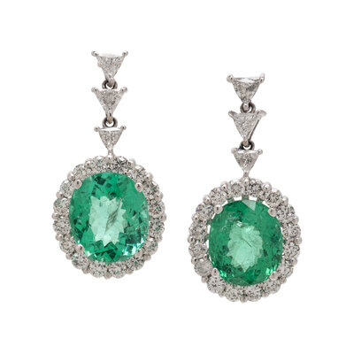 Containing two oval modified brilliant cut Paraiba-type tourmalines measuring 10.34 x 8.83 x 5.96 and 10.93 x 9.49 x 5.73 mm, with trillion and round brilliant cut diamonds weighing approximately 2.40 carats total. Mounted in 18 karat white gold. 1 inch long.