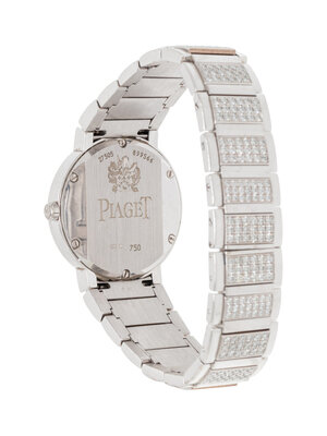 Stamps: Case back: PIAGET 27505 899566 750 (Swiss hallmark). Bracelet: PIAGET 750 (Swiss hallmark).