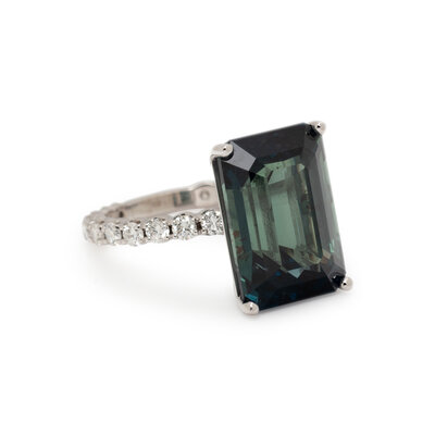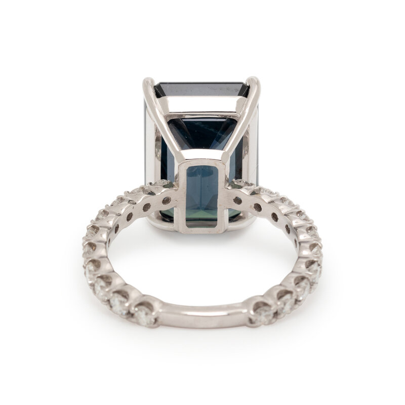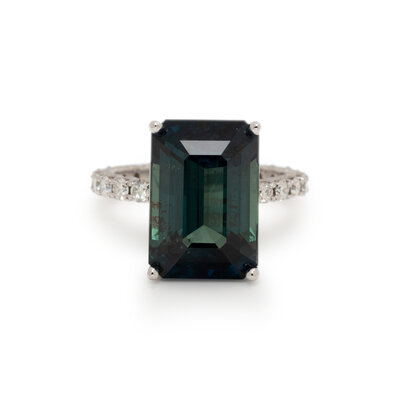 Containing one octagonal step cut sapphire measuring 14.94 x 10.30 x 7.67 mm and weighing 12.25 carats, with round brilliant cut diamonds weighing approximately 0.65 carat total. Mounted in 18 karat white gold. Ring size 6.