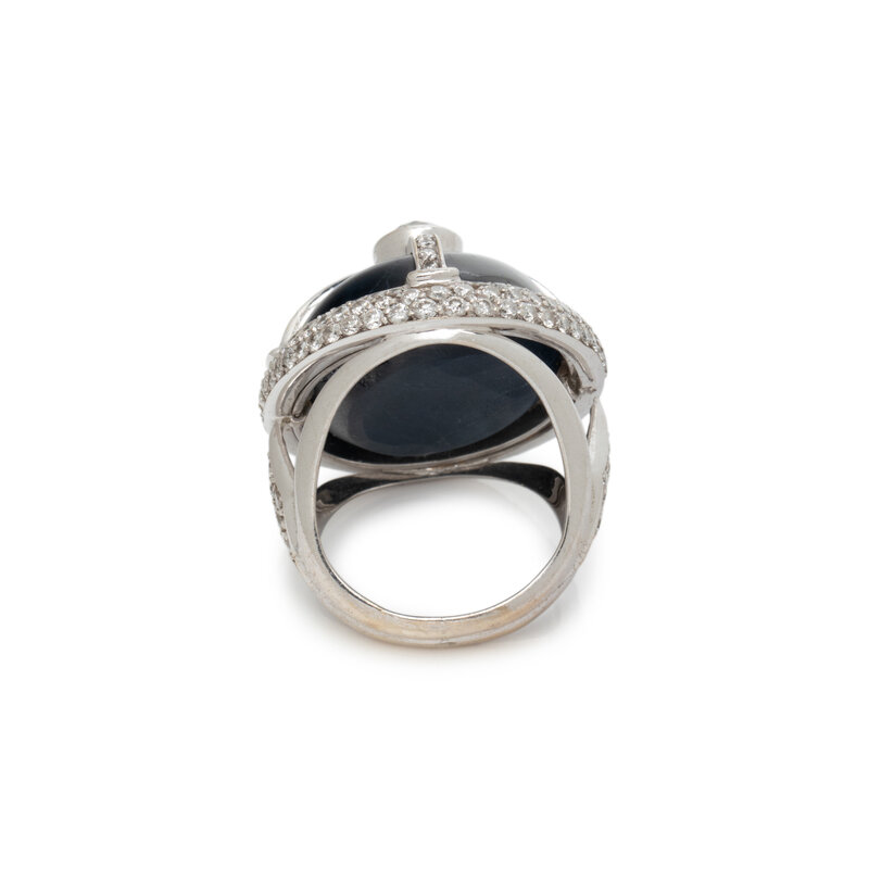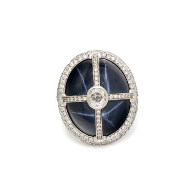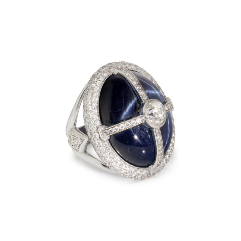 Containing an oval cabochon star sapphire measuring approximately 23.00 x 18.75 x 9.55 mm, old mine cut diamond weighing approximately 0.70 carats, and pavé-set round brilliant cut diamonds weighing approximately 2.00 carats total. Mounted in 18 karat white gold. Ring size 6 1/2.