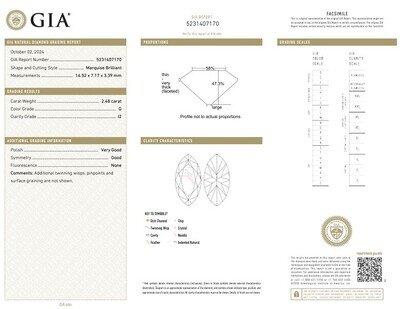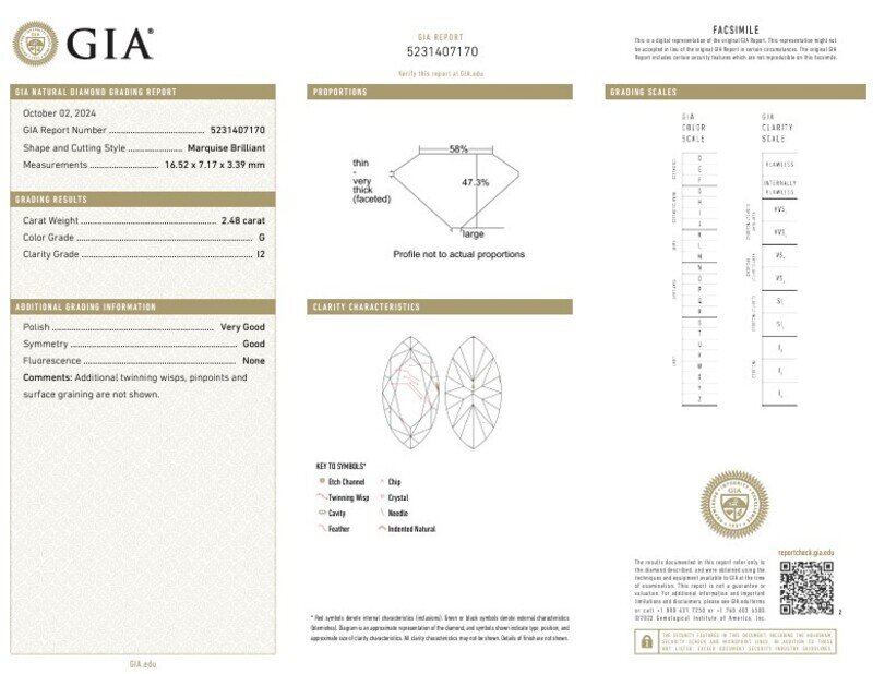 GIA, 2024, Report No. 5231407170, 2.48 carats, G color, I2 clarity, No fluorescence