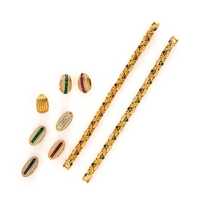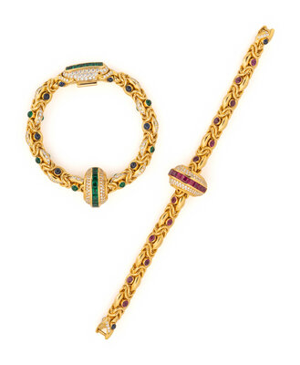 Consisting of two fancy link bracelets set with round brilliant cut diamonds, round faceted rubies, round cabochon sapphires and emeralds, with four interchangeable clasps set with round brilliant cut diamonds and channel set diamonds, rubies, sapphires, and emeralds, and three enhancers set with round brilliant cut diamonds, and channel set rubies and emeralds. 18 karat yellow gold. Bracelets: 7 1/8 inches inner circumference; 14 1/4 inches inner circumference together.