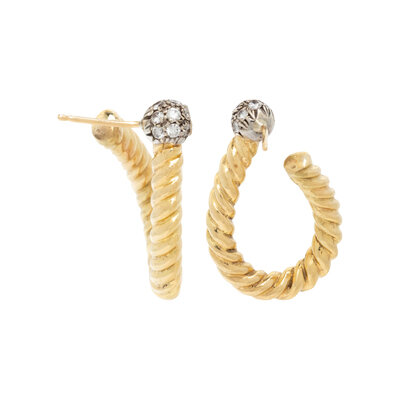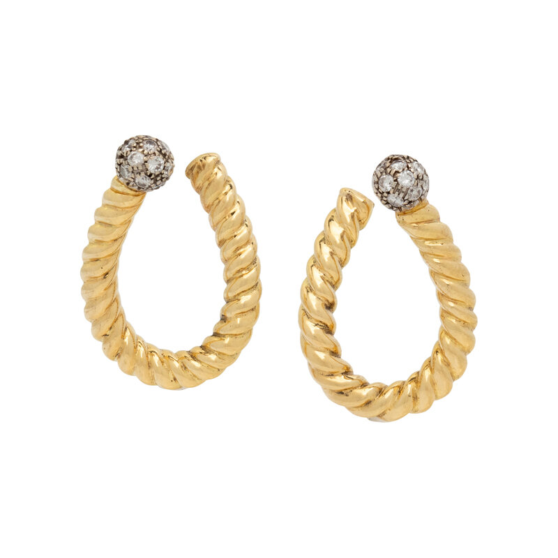 Consisting of twisted gold hoops, the terminals set with round brilliant cut diamonds. 18 karat yellow and white gold. 1 1/4 inches long.