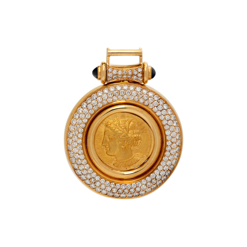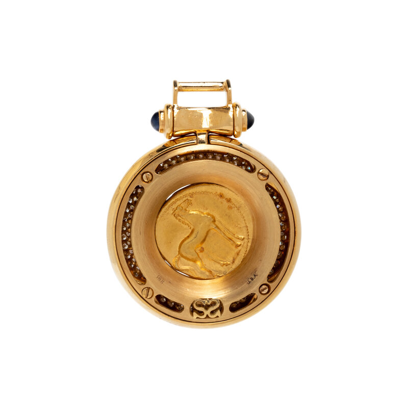 GOLD COIN, DIAMOND, AND SAPPHIRE PENDANT