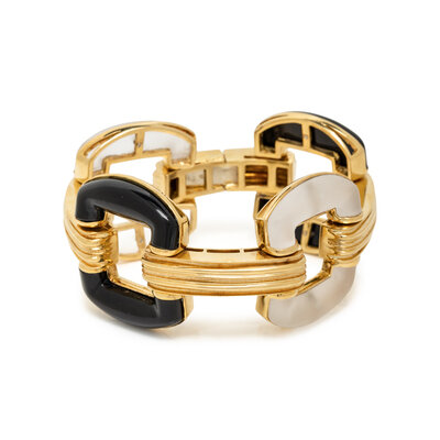 Containing links set with fitted alternating black onyx and colorless frosted crystal. Mounted in 18 karat yellow gold. 7 1/4 inches long, 1 7/16 inches wide.